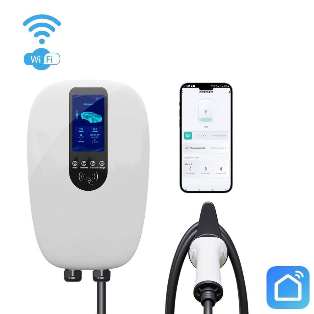 Išmani 11kW galingumo įkrovimo stotelė su integruotu 5 metrų kabeliu Type 2 ir dideliu spalvotu LCD ekranu. Pasikrausite savo elektromobilį iki 10 kartų greičiau! Lyginant su 220V tinklo įkrovikliu.